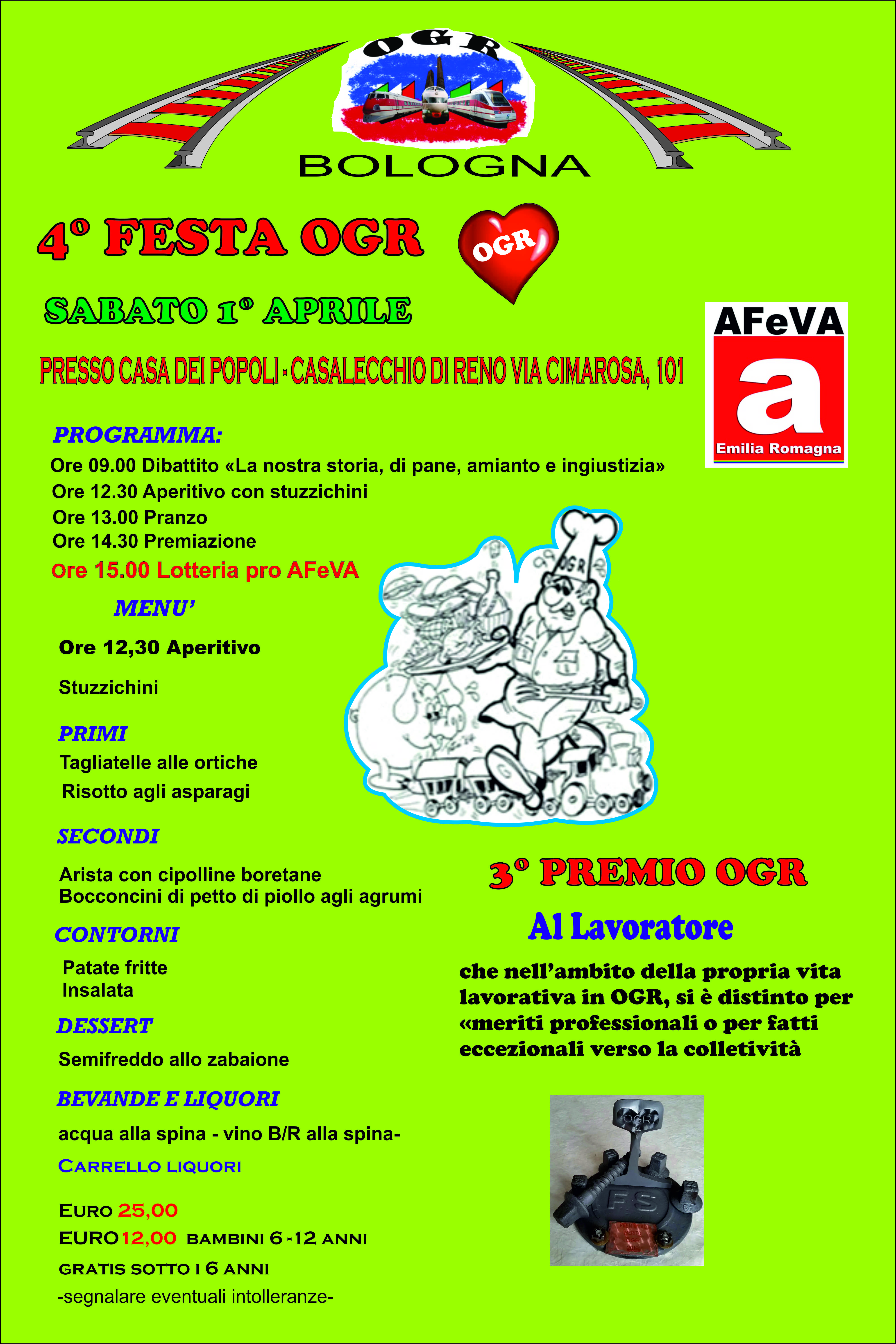 Il 1° aprile prossimo, tutti coloro che hanno lavorato, e lavorano, all’OGR di Bologna (le loro famiglie) e tutti gli amici sono invitati al tradizionale ritrovo presso la Casa dei Popoli di Casalecchio di Reno, in Via Cimarosa, 101. (scarica la locandina con il programma ed il menù)
