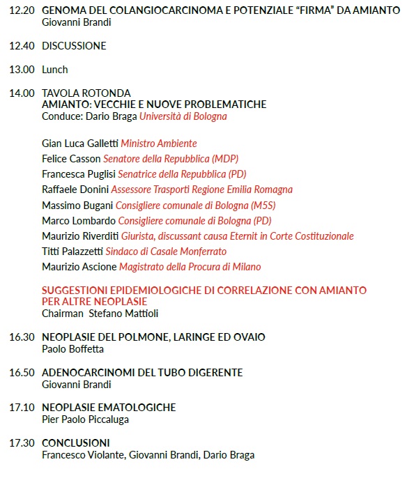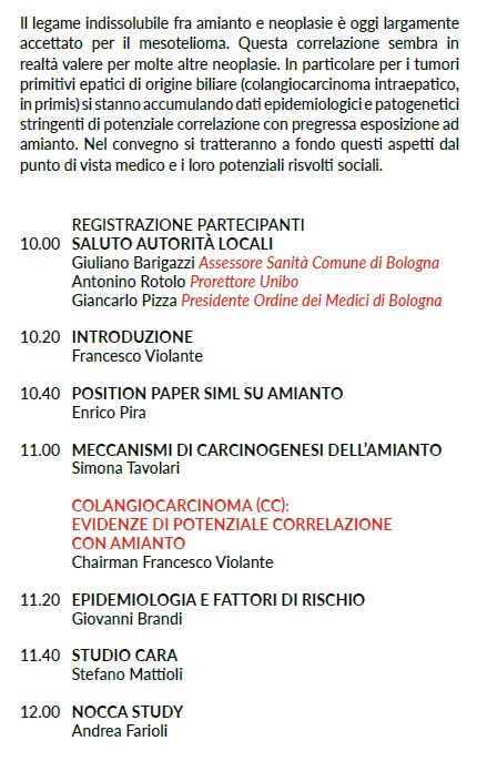 Ancora più difficile nel caso di tumori con diversi organi bersaglio, fra questi il “colangiocarcinoma” (tumore dei dotti biliari del fegato). Questo tema, il nesso causale fra insorgenza del colangiocarcinoma ed esposizione ad amianto, sarà al centro della comunicazione di Giovanni Brandi “genoma del colangiocarcinoma e potenziale firma da amianto”.