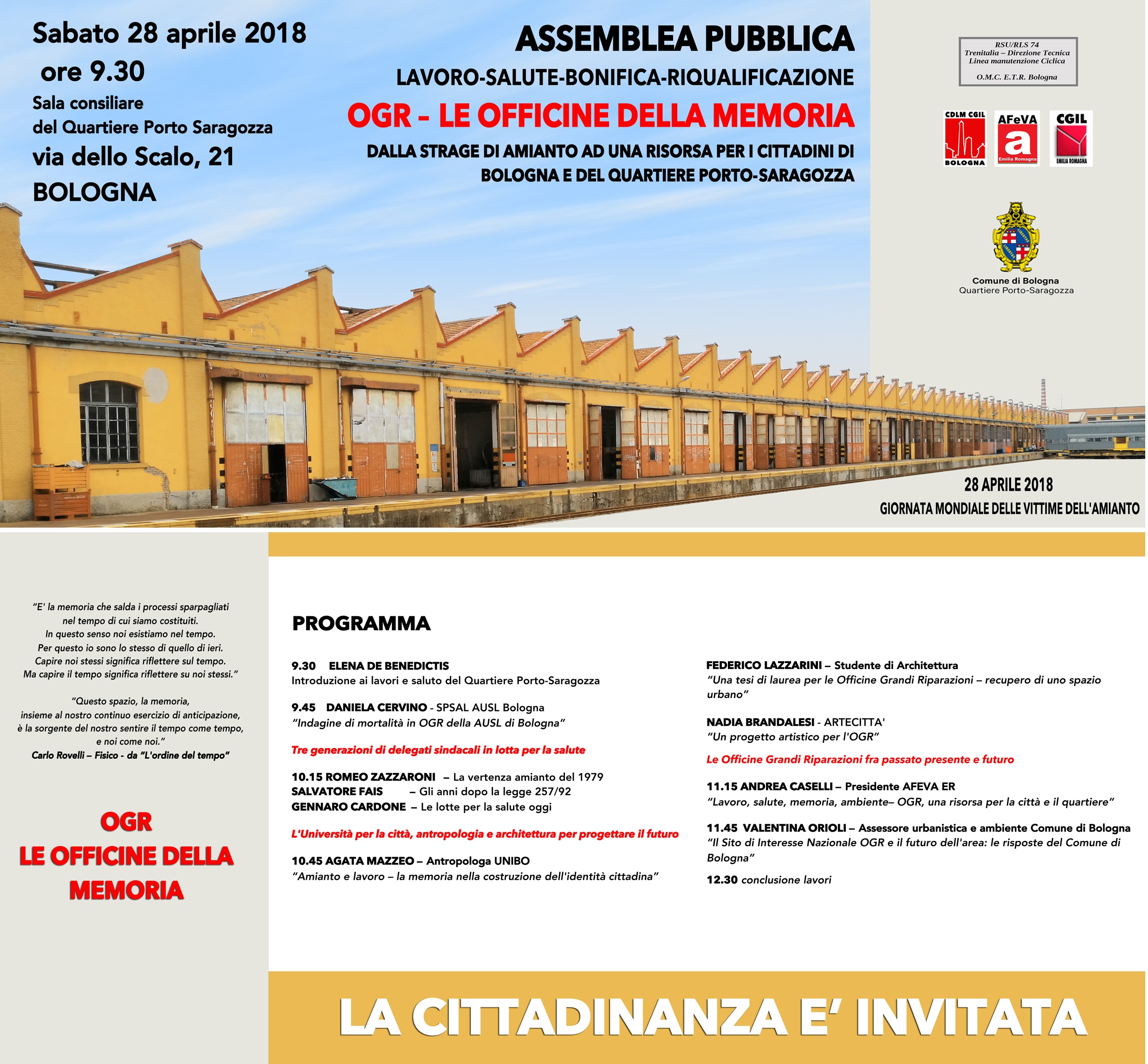 Il 28 aprile 2018 in occasione della Giornata Mondiale delle Vittime dell’Amianto, la CGIL Emilia Romagna, la Camera del Lavoro Metropolitana di Bologna, la RSU/RLS delle Officine, l’AFeVA Emilia Romagna e il Quartiere Porto-Saragozza organizzano una