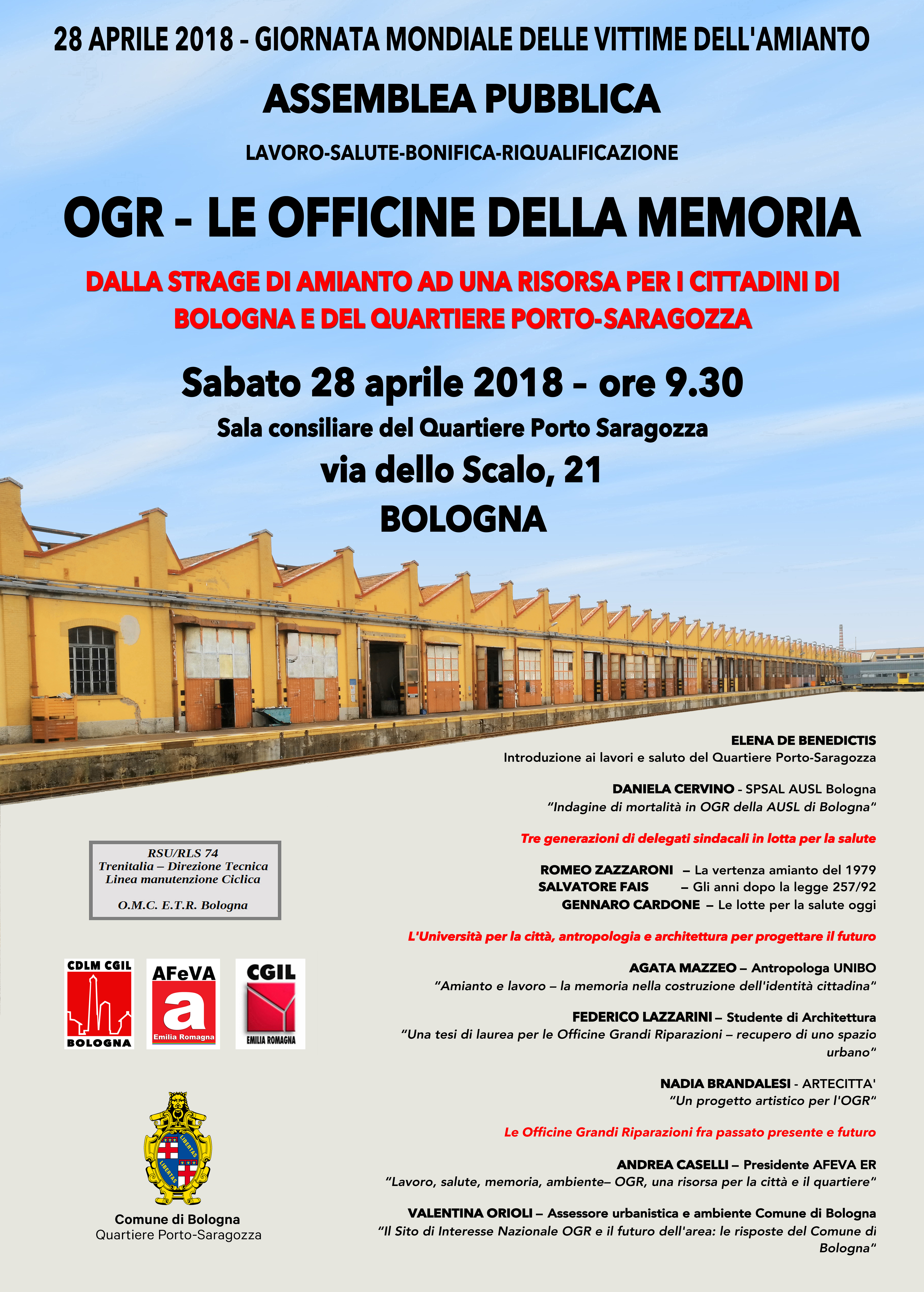 Importante convegno in occasione della “Giornata mondiale delle vittime dell’Amianto” sul futuro delle Officine Grandi Riparazioni delle FF.SS. di Bologna, promosso da AFeVA Emilia Romagna, CGIL Emilia Romagna, CDLM Bologna, RSU/RLS OMC Trenitalia e il Q.RE Porto Saragozza di Bologna.
