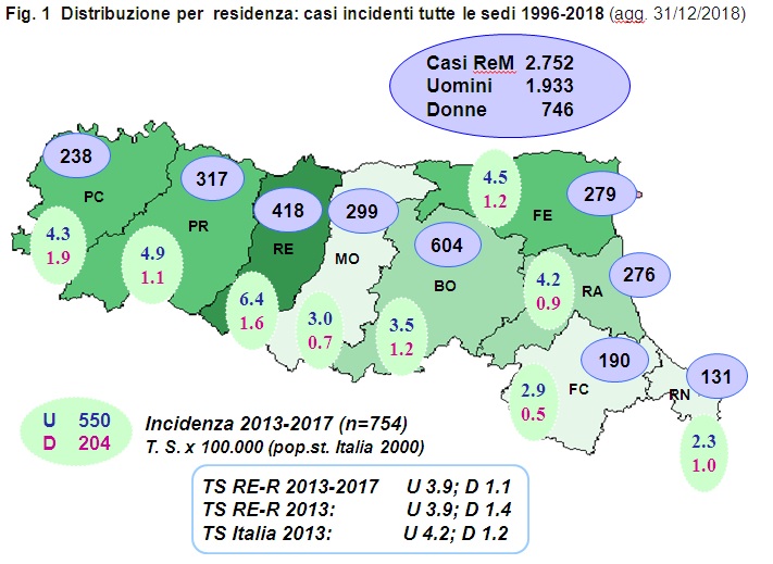 Il tasso di incidenza regionale per 100.000 abitanti (TIS), calcolato per il periodo 2013-2017 e standardizzato con il metodo diretto con la popolazione italiana 2000, è pari a 3,9 negli uomini e 1,1 nelle donne. Il tasso più alto negli uomini è stato registrato a Reggio Emilia (6,4) e nelle donne a Piacenza (1,9). Sono risultati superiori alla media regionale anche i TIS, per uomini e donne, a Piacenza, Reggio Emilia e Ferrara; per le sole donne a Bologna e per i soli uomini a Ravenna e Parma. La provincia di Rimini registra il tasso più basso per gli uomini (2,3), e quella di Forlì-Cesena il tasso più basso per le donne (0,5).