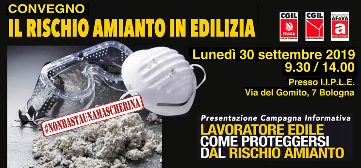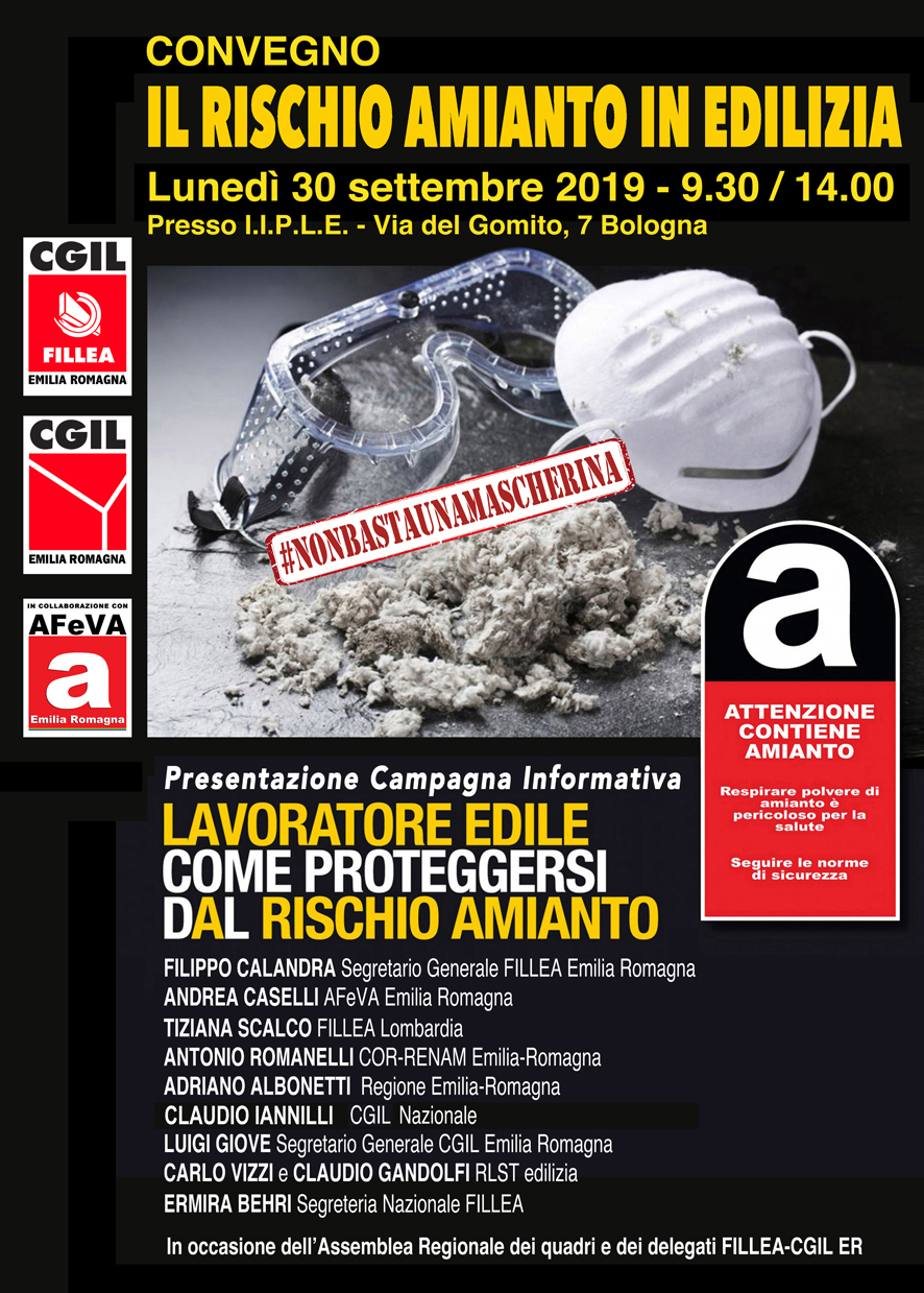 Organizzato dalla FILLEA EMILIA ROMAGNA, dalla CGIL Emilia Romagna con la collaborazione di AFeVA Emilia Romagna, il giorno 30 settembre 2019 si terrà a Bologna presso la sede della I.I.P.L.E – Scuola di formazione edile in via del Gomito, 7 – il Convegno(*) di presentazione della Campagna informativa “Lavoratore edile come proteggersi dal rischio amianto” elaborata nell’ambito del “Progetto Amianto”, dal titolo “IL RISCHIO AMIANTO IN EDILIZIA” runa iniziativa volta a informare e tutelare i lavoratori dell’edilizia dal rischio amianto, nel corso dei lavori di ristrutturazione edile.