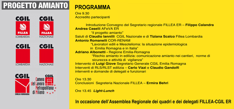 Si tratta di presentare un lavoro che ha prodotto un depliant informativo sul rischio amianto che corrono i lavoratori dell’edilizia. Lavoro che è stato possibile dalla comune volontà di alcune strutture della CGIL e più precisamente dalla FILLEA CGIL Nazionale e Lombarda, dalla CGIL Nazionale, Lombardia ed Emilia Romagna e dalla Camera del Lavoro di Milano. Il gruppo di lavoro era composto da: Tiziana Scalco (FILLEA Lombardia), Ermira Behri (FILLEA Nazionale), Claudio Iannilli (CGIL Nazionale), Massimo Balzarini (CGIL Lombardia), Andrea Caselli (CGIL Emilia Romagna), Addo Buriani (CDLM Milano), Carlo Vizzi (RLST Edilizia Parma) e col contributo di Emanuele Colombo per l’idea e la realizzazione grafica.
