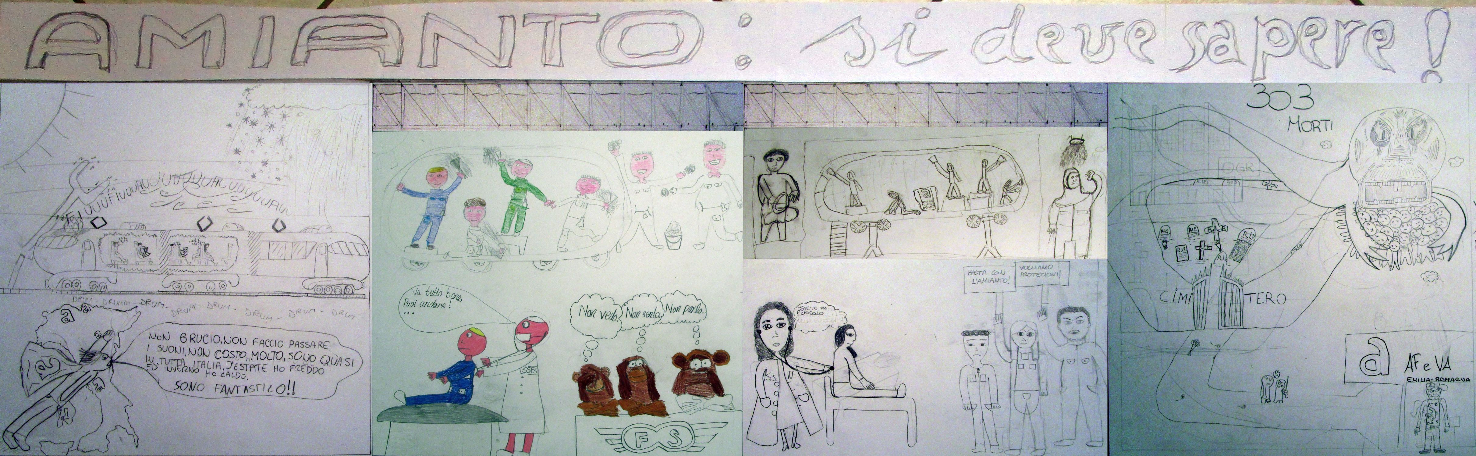 Le/i giovani artiste/i, nel percorso di realizzazione dell’Opera avevano conosciuto le vicende delle Officine Grandi Riparazioni dalla viva voce dei protagonisti: Salvatore Fais, Antonio Matteo e Giovannino Albanese avevano raccontato come era la vita ed il lavoro con l’amianto, ma anche la passione per il lavoro e la cura con cui veniva realizzato nella “Università della Manutenzione” , Gennaro Cardone e Silvano De Matteo oggi delegati hanno spiegato l’impegno collettivo della tutela della salute e sicurezza dei lavoratori oggi, Leopoldo Magelli Medico del Lavoro ha spiegato quali sono gli effetti dell’amianto sulle persone, Agata Mazzeo, Antropologa, ha portato la testimonianza dell’amianto in Italia e nel mondo, Massimo Vaggi Avvocato civile ha illustrato la questione delle responsabilità e della giustizia, Maurizio Lombardi che ha spiegato cosa è l’amianto. Dopo questa immersione nel problema si è passati alla ideazione e realizzazione dei pannelli artistici assistiti da ARTECITTA’.