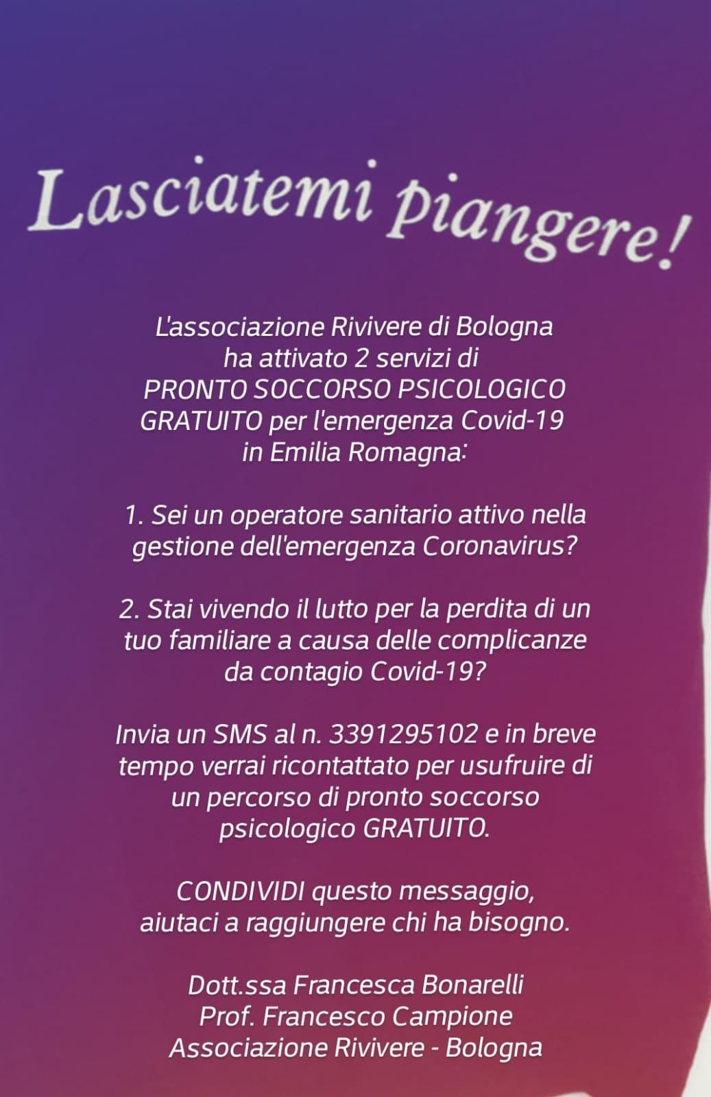 L’Associazione RIVIVERE di Bologna, da anni impegnata nel supporto psicologico a persone che hanno vissuto un lutto, ha deciso in questa fase drammatica della pandemia di coronavirus di attivare 2 servizi di PRONTO SOCCORSO PSICOLOGICO GRATUITO PER L’EMERGENZA DI Covid-19 in Emilia Romagna.