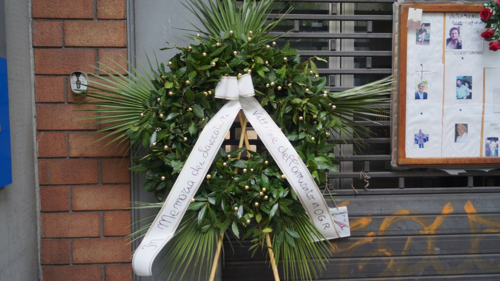 Deposta una corona di alloro all’Ingresso del vecchio stabilimento OGR di Via Casarini, in memoria delle vittime dell’amianto delle OFFICINE GRANDI RIPARAZIONI di Bologna. Continua la battaglia per la bonifica del Sito e per la sua restituzione alla Città di Bologna.