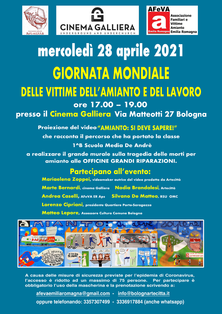 Orgogliosi di avere inaugurato dopo 14 mesi di chiusura a causa dell’epidemia di COVID-19 il Cinema Galliera a Bologna. Un grazie sentito a Marta Bernardi e a Mattia Della Casa per il supporto e la squisita disponibilità, ma anche per avere condiviso la battaglia per Amianto Zero.