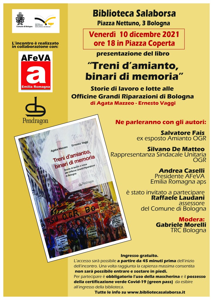 Gabriele Morelli, giornalista di TRC coordinerà l’incontro con gli autori, con la partecipazione di Raffaele Laudani Assessore all’Urbanistica ed al progetto città della conoscenza e della Memoria Democratica di Bologna; con Salvatore Fais ex-esposto OGR, Silvano De Matteo delegato sindacale OMC (ex-OGR) ed Andrea Caselli Presidente di AFeVA Emilia Romagna.
