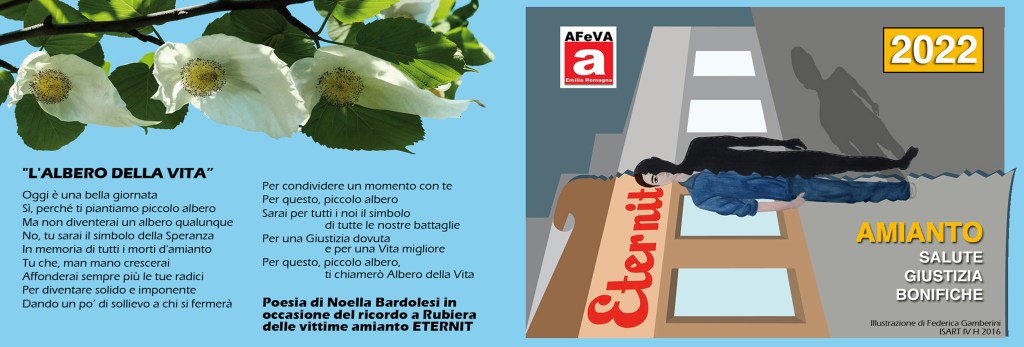 Poi la dicitura “Amianto – salute giustizia bonifiche ” che riassume gli obiettivi che AFeVA ER si è data dalla sua costituzione e che continuano ad essere il programma per l’anno che viene.