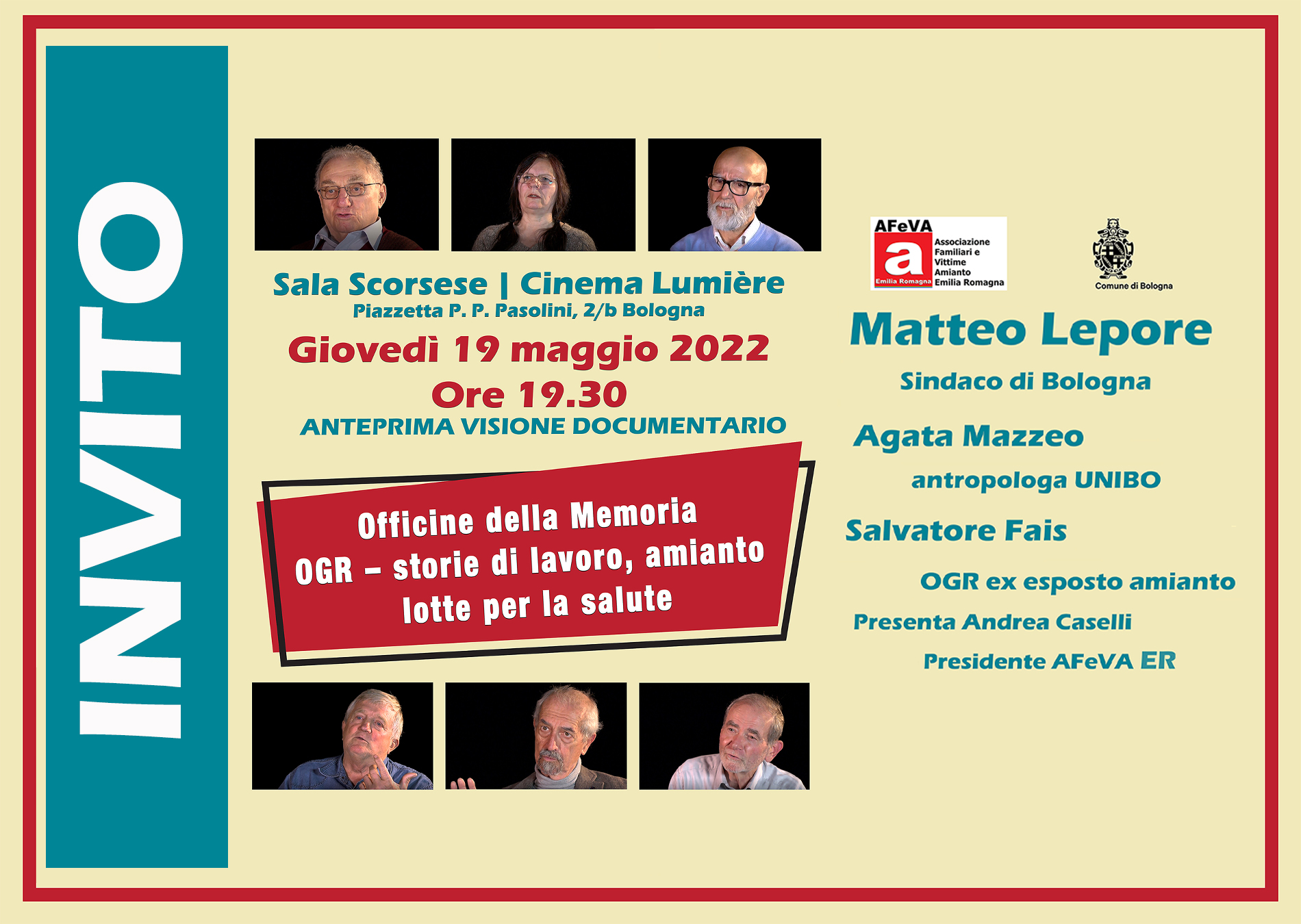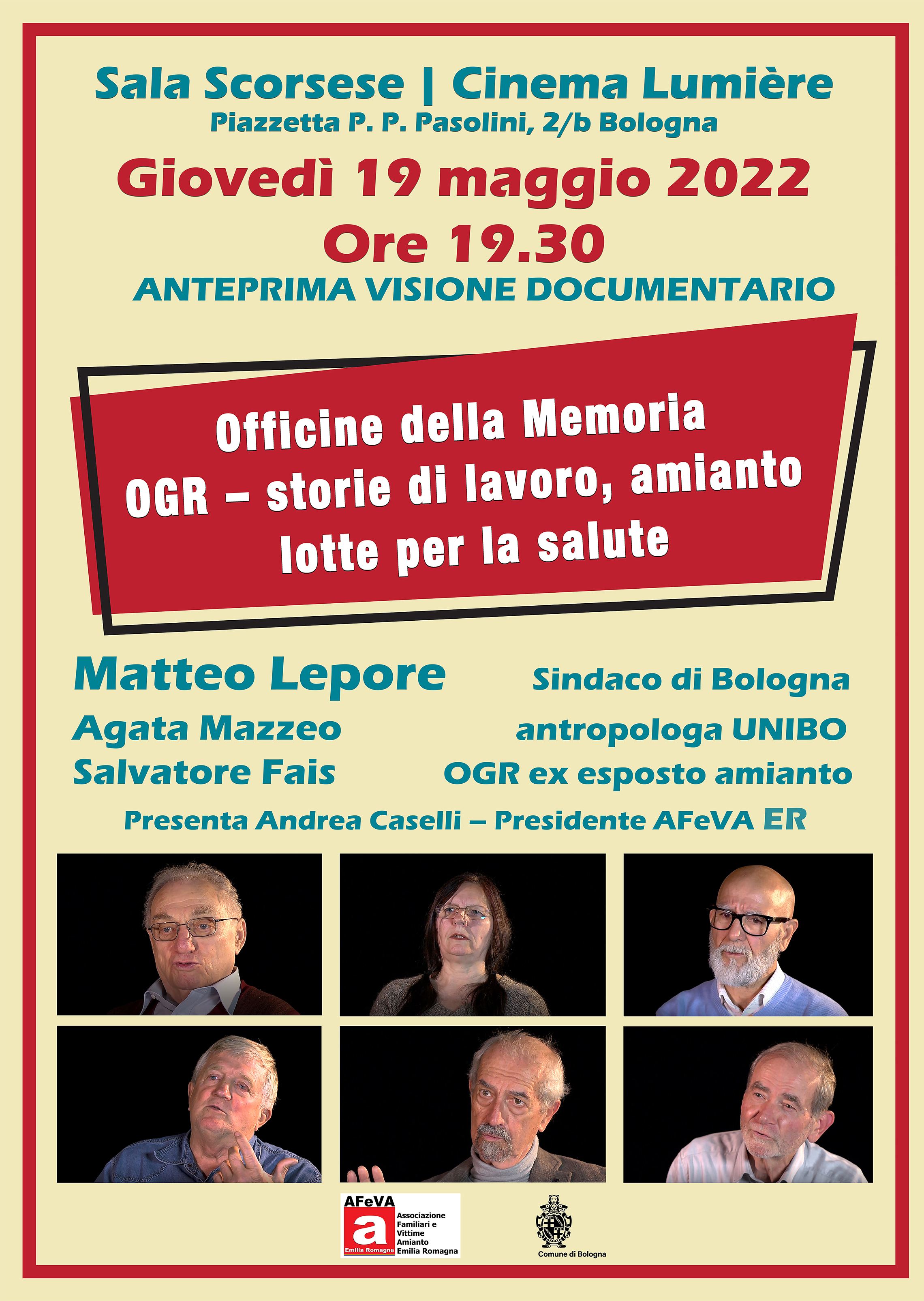 Nel documentario, realizzato nell’ambito del Patto di Collaborazione fra Comune di Bologna e Associazione Familiari e Vittime Amianto Emilia Romagna, potremo ascoltare e vedere le interviste ad alcuni dei protagonisti della vertenza amianto del 1979: Giuseppe Daini e Romeo Zazzaroni – Delegati sindacali OGR, Gianni Dalmonte, lavoratore OGR purtroppo deceduto a causa del Mesotelioma da amianto che lo ha colpito, Noella Bardolesi vedova di Loriano Operaio OGR deceduto a causa di un mesotelioma, Salvatore Fais – RLS OGR ed animatore del Museo OGR, Leopoldo Magelli – Medico del Lavoro impegnato nella vicenda OGR.