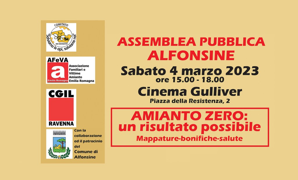 Il Comitato Salviamo le api, salviamo noi – Progetto otto passi per l’ambiente di Alfonsine, l’Associazione Familiari e Vittime Amianto Emilia Romagna aps, la CGIL di Ravenna invitano la cittadinanza a partecipare. L’iniziativa è patrocinata dal Comune di Alfonsine.
