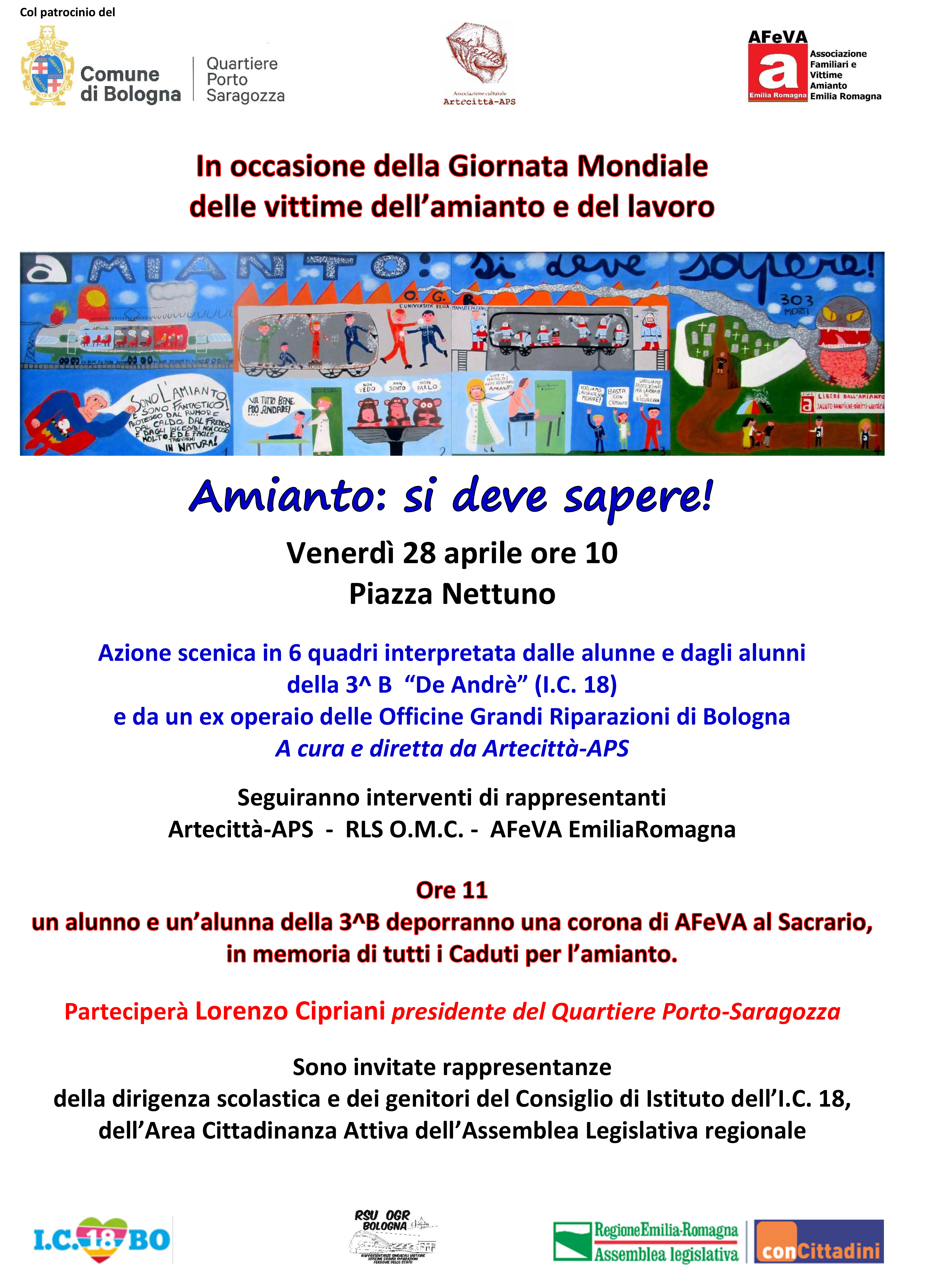Venerdi 28 Aprile alle ore 10,00 presso Piazza Nettuno a Bologna, in occasione della Giornata Mondiale delle vittime dell’amianto e del lavoro, si terrà la seguente iniziativa: