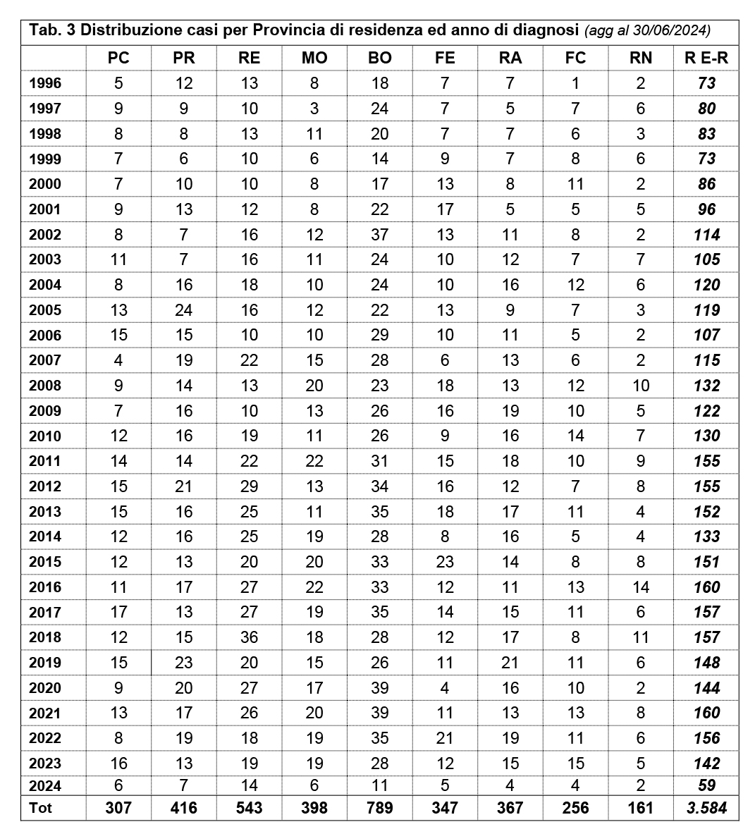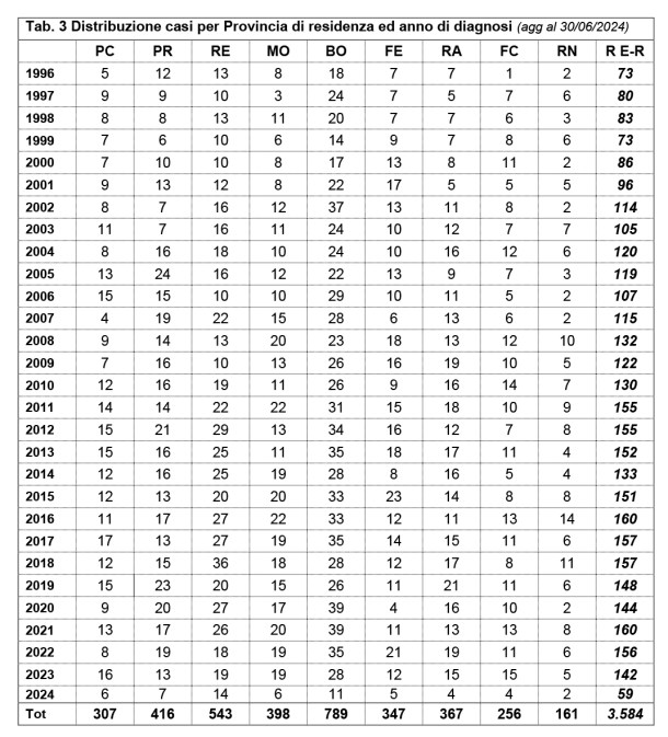 Di seguito la tabella del report sui casi di mesotelioma in Emilia Romagna per anno e per provincia: