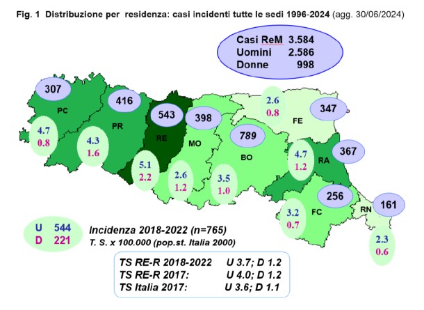 Al 30 giugno 2024, risultano archiviati 4.362 casi, tra cui 203 sospetti, risultati alle successive indagini non mesoteliomi e 4.159 mesoteliomi maligni. Tra questi, 107 risultano incidenti in epoca anteriore al 01/01/1996, data di inizio della rilevazione dell’incidenza su base regionale, e 468 diagnosticati in persone non residenti nella nostra Regione, la cui documentazione è stata per intero trasmessa al COR di residenza.
