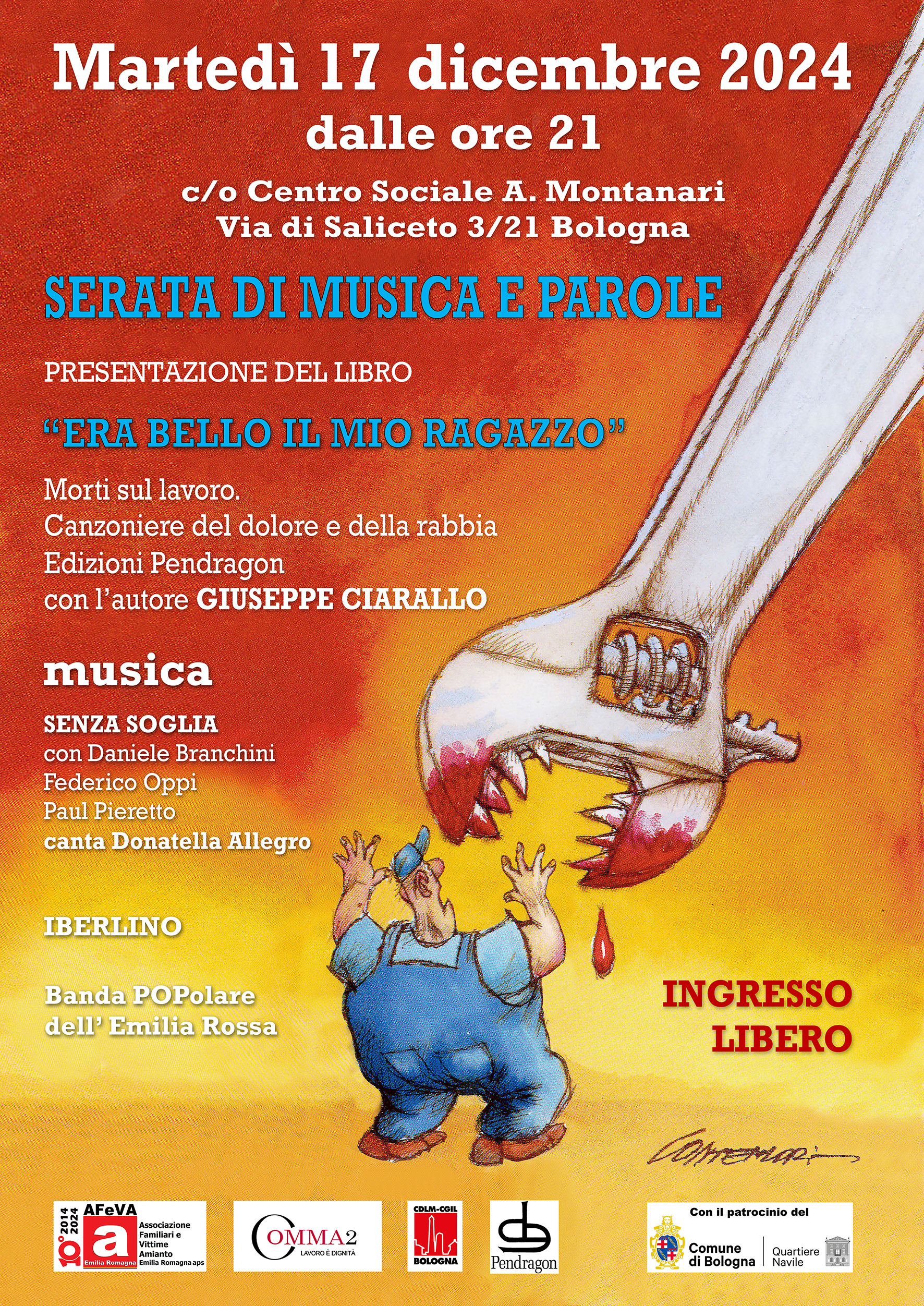 In occasione della pubblicazione del libro di Giuseppe Ciarallo “ERA BELLO IL MIO RAGAZZO” Morti sul lavoro. Canzoniere del dolore e della rabbia. Ed. Pendragon, AFeVA Emilia Romagna, Comma 2, CDLM CGIL BO – Con il patrocinio del Q.re Navile, organizzano una serata di musica e parole nella quale saranno eseguiti diversi brani contenuti nel Canzoniere, poi commentati dall’Autore del Libro Giuseppe Ciarallo.