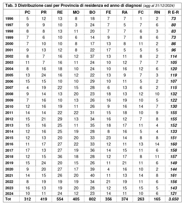 Di seguito la tabella del report sui casi di mesotelioma in Emilia Romagna per anno e per provincia: