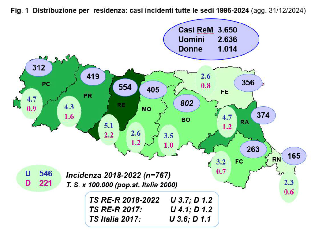 Nota 1: Il Registro Mesoteliomi rileva incidenza/esposizione ad amianto di questa temibile patologia neoplastica ad alta frazione eziologica professionale su tutto il territorio della Regione Emilia-Romagna dal 1996.