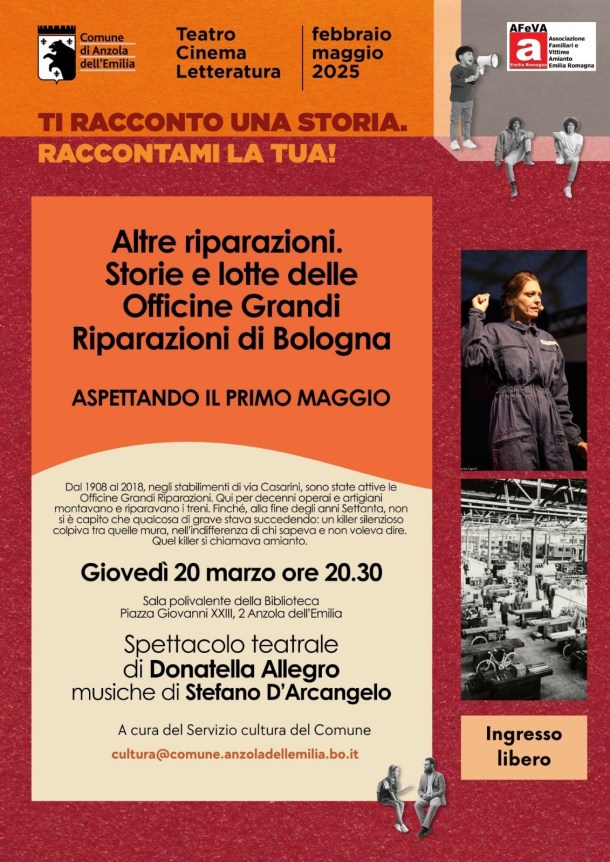 Il Comune di Anzola Emilia nell’ambito della rassegna di Teatro-Cinema-Letteratura “TI RACCONTO UNA STORIA. RACCONTAMI LA TUA” aspettando il Primo Maggio promuove lo spettacolo teatrale: