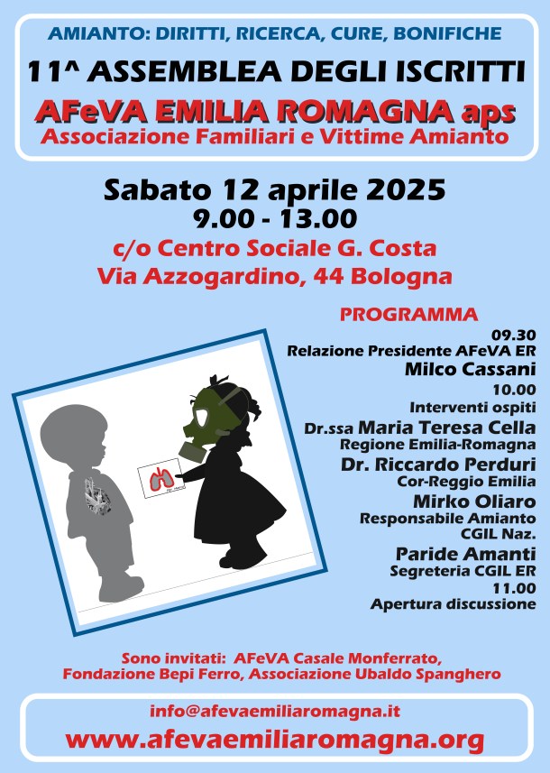 è convocata l’Assemblea ordinaria degli Iscritti ad AFeVA – Associazione Familiari e Vittime Amianto Emilia Romagna aps.