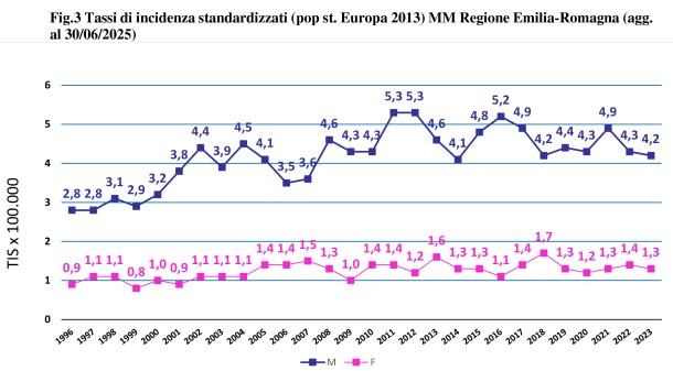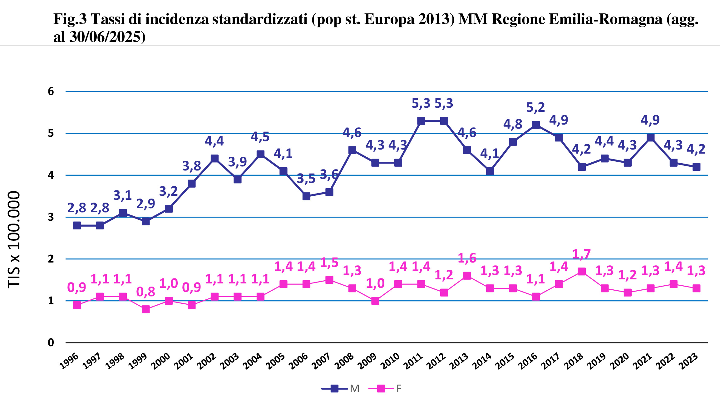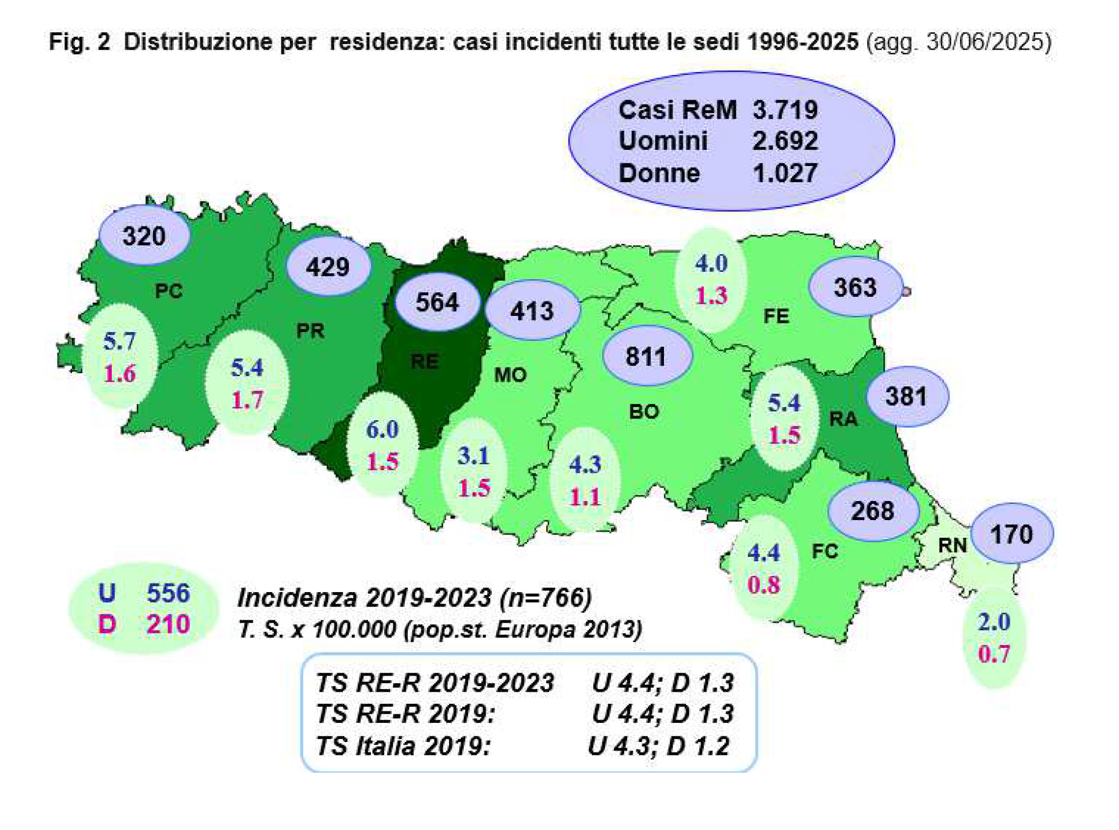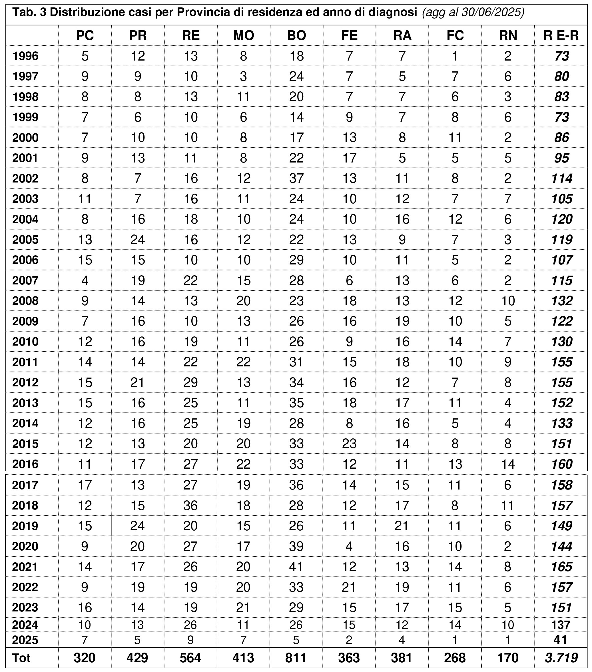 Nota 1: Il Registro Mesoteliomi rileva incidenza/esposizione ad amianto di questa temibile patologia neoplastica ad alta frazione eziologica professionale su tutto il territorio della Regione Emilia-Romagna dal 1996.