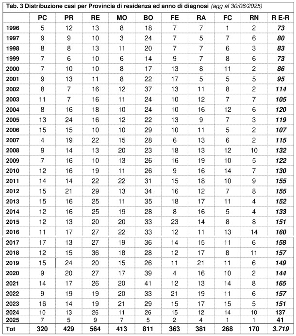 Di seguito la tabella del report sui casi di mesotelioma in Emilia Romagna per anno e per provincia: